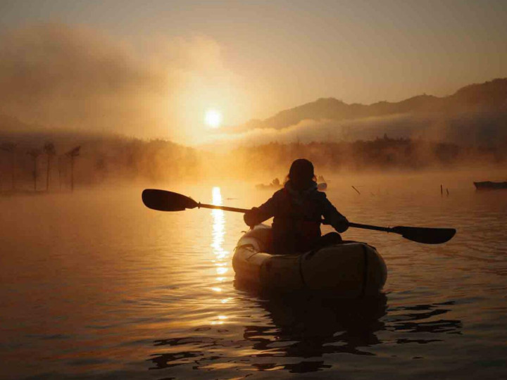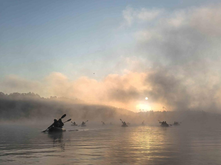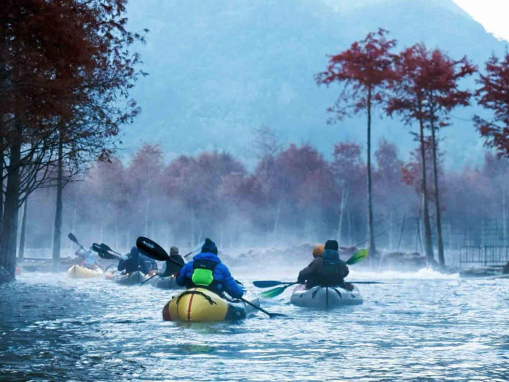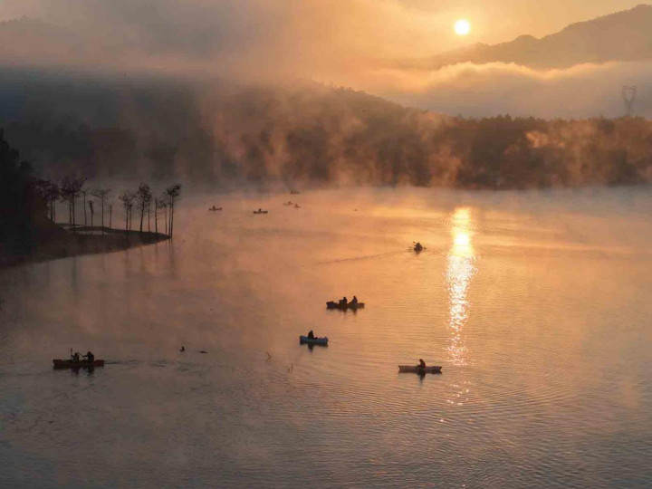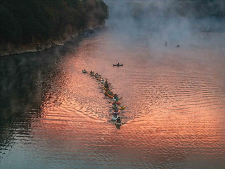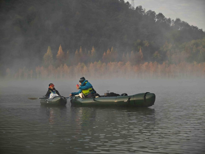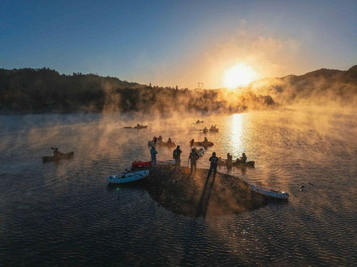 Hmappy社群的活动则更像是一场老友年度聚会。四十余位伙伴,三十余艘MRS背包艇,在晨雾未散、朝霞初染的破晓时分,静静划入这幅天地铺就的山水画卷。无论是初见者眼中的惊艳,还是故地重游者心中的沉醉,亦或是终于得见“朝霞与晨雾同辉”那份圆满,都让这场划水体验超越了简单的游玩。