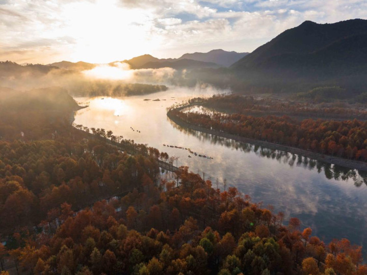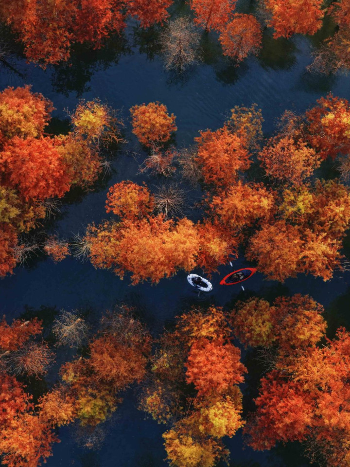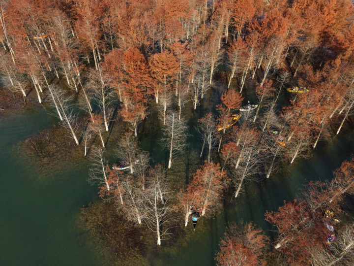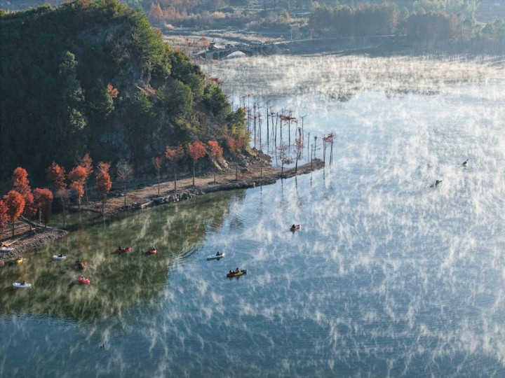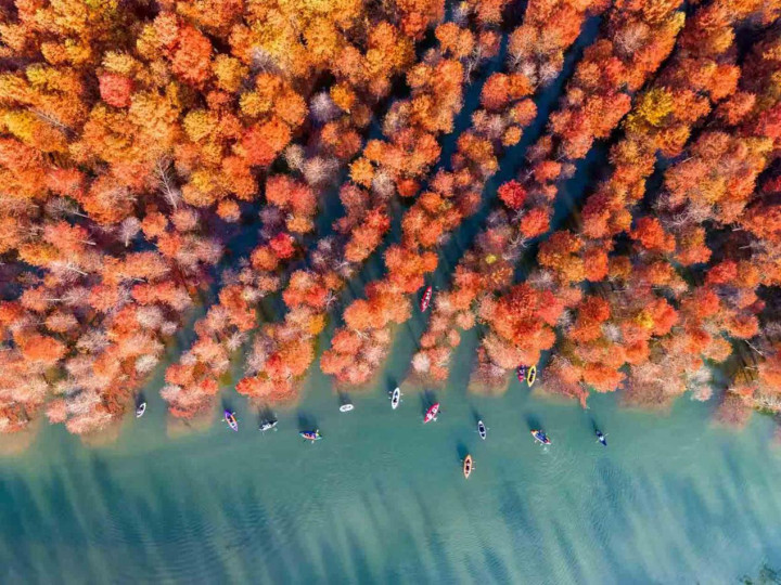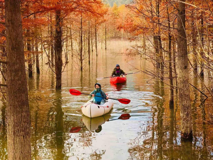 初冬的宁国方塘乡,落羽杉湿地公园的红杉林正式迎来了一年中最绚烂的时光。这片被誉为“皖南喀纳斯”的水上森林,在每年11月上旬至12月上旬呈现最美景观。不同于其他红叶景观,这片红杉林独特地“浮”在水面上。而划船则成为融入这幅天然画卷的最佳方式。